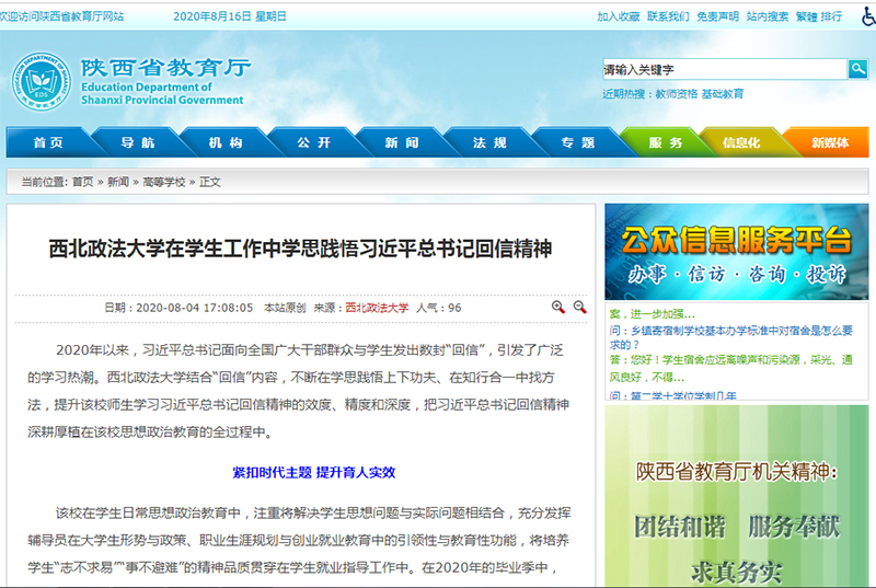 该校在学生日常思想政治教育中,注重将解决学生思想问题与实际问题相结合,充分发挥辅导员在大学生形势与政策、职业生涯规划与创业就业教育中的引领性与教育性功能,将培养学生“志不求易”“事不避难”的精神品质贯穿在学生就业指导工作中。在2020年的毕业季中,校长杨宗科以“志不求易,事不避难”“用时代浪潮淬炼奋斗人生”为题,为全体毕业生讲最后一课。该校向全体学生发出了“做好新时代收信人”的学习号召,有不少学生成功考取新疆、西藏等地基层公检法部门职位,多名学生选择将新疆克拉玛依市、阿克苏等地区作为自身职业发展的落脚点,将法治中国的理念植根在祖国需要的地方。同时,该校通过举办线上毕业优秀学子学风报告会、杰出校友创设奖助学金暨优秀学子线上表彰大会等形式,发挥朋辈示范作用,引导教育学生贯彻落实习近平总书记的回信精神,树立把个人的理想追求融入党和国家事业之中的职业追求。