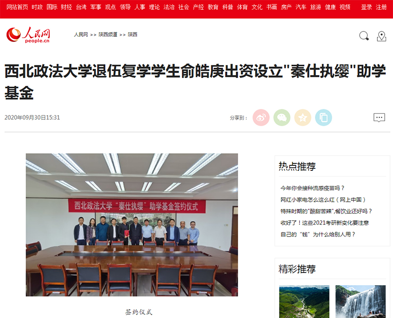 2020年1月初,俞皓庚同学多次与学校联系沟通,拿出个人攒下的生活补助和退伍军人就业安置补助金共计15万元设立“秦仕执缨”助学基金,该助学基金包括渭南市铁王村扶贫助学金、山阳中学励志奖学金及西北政法大学帮困救助基金等三个项目,集中资助西北政法大学扶贫点及校内贫困学生。目前,相关款项的发放工作正在进行中。