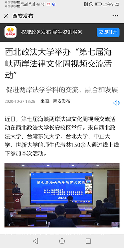 近日,第七届海峡两岸法律文化周视频交流活动在西北政法大学长安校区举行。来自西北政法大学,台湾东吴大学、台北大学、中正大学、世新大学的师生代表共150余人通过线上线下参加本次活动。