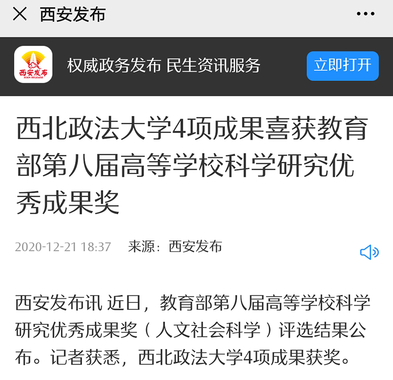 西安发布讯 近日,教育部第八届高等学校科学研究优秀成果奖(人文社会科学)评选结果公布。记者获悉,西北政法大学4项成果获奖。