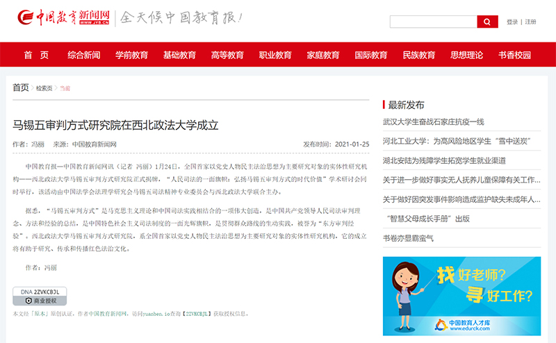 中国教育报—中国教育新闻网讯(记者 冯丽)1月24日,全国首家以党史人物民主法治思想为主要研究对象的实体性研究机构——西北政法大学马锡五审判方式研究院正式揭牌,“人民司法的一面旗帜:弘扬马锡五审判方式的时代价值”学术研讨会同时举行,该活动由中国法学会法理学研究会马锡五司法精神专业委员会与西北政法大学联合主办。