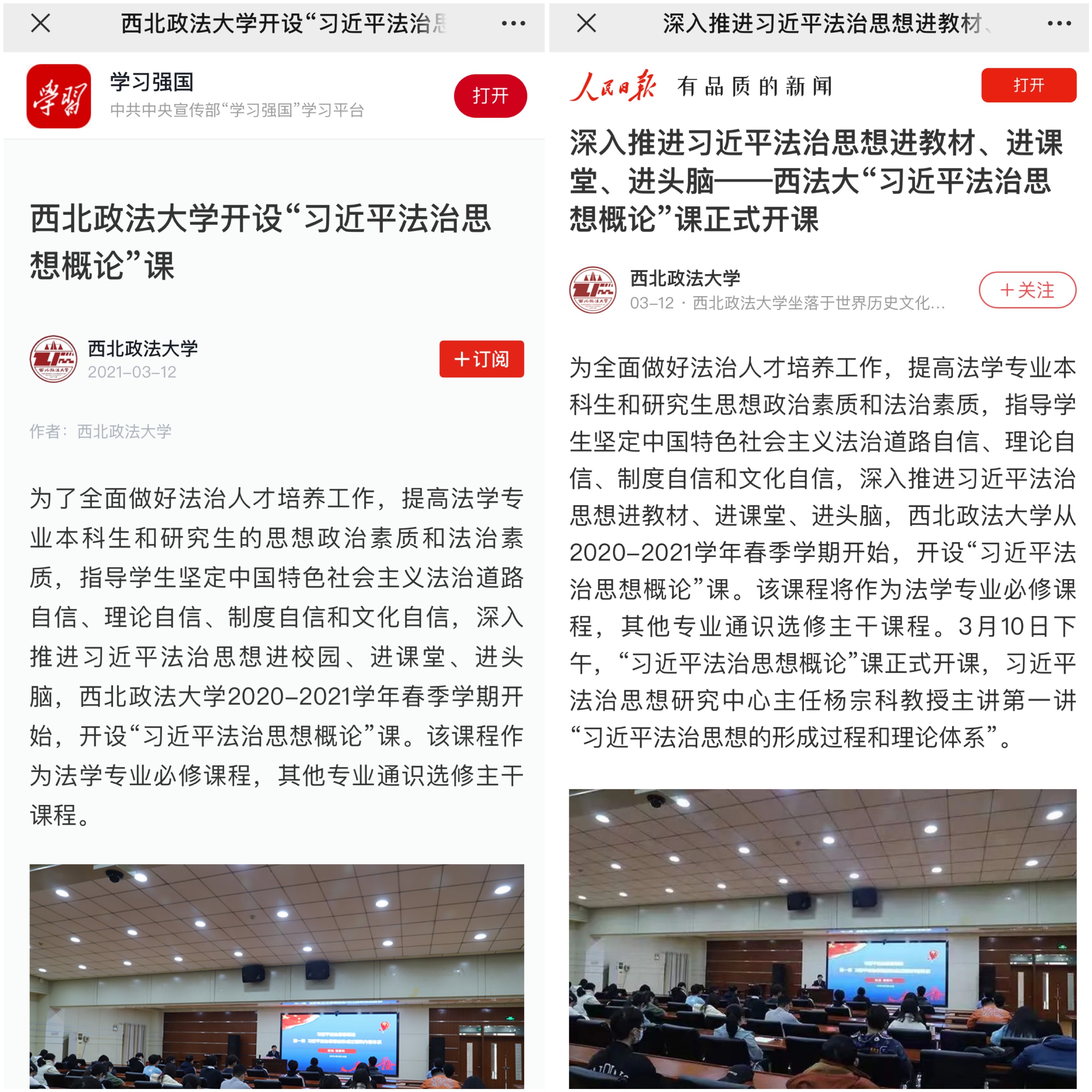 【人民网】【学习强国】 为了全面做好提高法学专业本科生和研究生的思想政治素质和法治素质,深入推进习近平法治思想进校园、进课堂、进头脑,西北政法大学从2020-2021学年春季学期开始,开设“习近平法治思想概论”课。3月12日记者获悉,该课程作为法学专业必修课程,其他专业通识选修主干课程。
