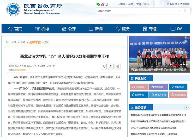 ——守“初心”,思想教育不断线。该校将思想价值引领贯通暑假期间思想政治教育工作。一是党史学习教育不断线,在学工部公众号上分别设置党史人物、党史问答、党史百年等板块,发布相关推送39篇,择优发布由辅导员担任主讲人的微党课“辅导员说|青春微党课”10篇,将党史学习教育融入网络思政工作。二是创新教育工作形式,组织开展“法暖万家 强国有我”实践教育活动、“庆祝建党百年 传承红色基因”主题艺术活动、“廉以养德,文以化人”主题文化作品征集、网络安全主题绘画作品和节目等相关活动,并与华阴市共建实践教育基地和优质生源基地,将线上与线下,德育与美育、劳育充分结合起来。三是扎实做好日常思想教育,走访暑假留校学生,慰问见习实习学生,先后发布《风雨与共,协力奋进——致全体辅导员的一封信》《2021年暑假致全体学生的一封信》等,持续做好学生的价值引领、学业指导、心理疏导等工作。