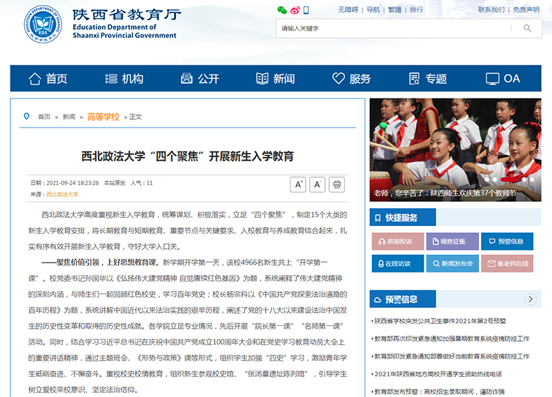 ——聚焦价值引领,上好思想教育课。新学期开学第一天,该校4966名新生共上“开学第一课”。校党委书记孙国华以《弘扬伟大建党精神 自觉赓续红色基因》为题,系统阐释了伟大建党精神的深刻内涵,与师生们一起回顾红色校史,学习百年党史;校长杨宗科以《中国共产党探索法治道路的百年历程》为题,系统讲解中国近代以来法治实践的艰辛历程,阐述了党的十八大以来建设法治中国发生的历史性变革和取得的历史性成就。各学院立足专业情况,先后开展“院长第一课”“名师第一课”活动。同时,结合学习习近平总书记在庆祝中国共产党成立100周年大会和在党史学习教育动员大会上的重要讲话精神,通过主题班会、《形势与政策》课等形式,组织学生加强“四史”学习,激励青年学生砥砺奋进、不懈奋斗。重视校史校情教育,组织新生参观校史馆、“张汤墓遗址陈列馆”,引导学生树立爱校荣校意识、坚定法治信仰。