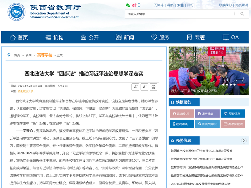 西北政法大学高度重视习近平法治思想在学生中的宣传教育实践。该校立足特色优势,精心谋划部署,认真组织实施,切实落实以“学理论、强引领、下基层、促创新”为思路的法治教育“四步法”,通过理论学习、实践调研、普法宣传等形式,将线上与线下、学习与实践紧密结合起来,让习近平法治思想在学生中“暖”起来,在实践中“活”起来。