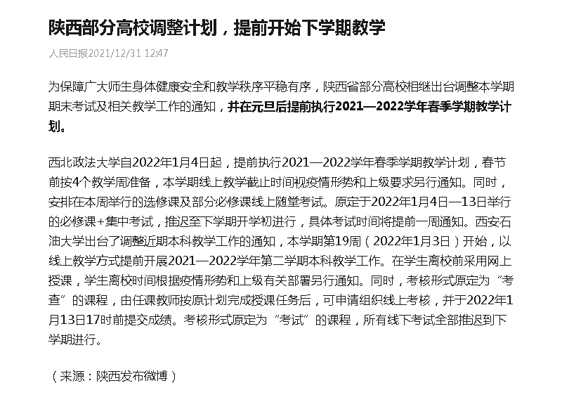 为保障广大师生身体健康安全和教学秩序平稳有序,陕西省部分高校相继出台调整本学期期末考试及相关教学工作的通知,并在元旦后提前执行2021—2022学年春季学期教学计划。