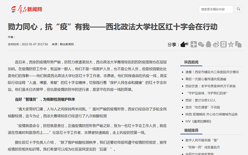 连日来,西安的疫情形势严峻,防控力度逐渐加大,西北政法大学雁塔校区的的防疫措施也在层层加码。在疫情防控工作中,有这样一群人,他们不是一线医护人员,也不是公务人员,但是校园里处处是他们的身影——他们就是西北政法大学社区红十字工作者、志愿者。他们同样奋战在抗疫一线,用实际行动诠释“人道、博爱、奉献”的红十字会精神,切身践行着“保护人民生命和健康”的红十字会宗旨。他们虽未白衣披甲,但也是疫情防控中的逆行者,是坚守在抗疫一线的英雄。