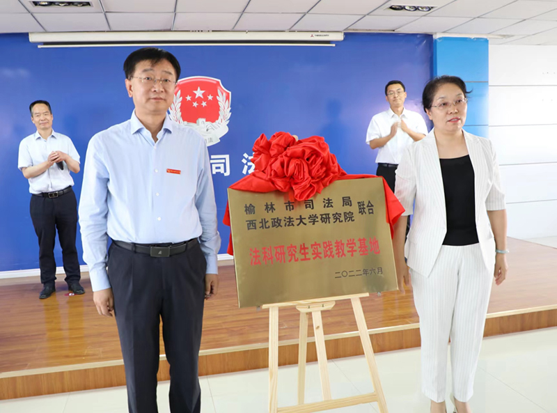 西北政法大学校长范九利和市司法局党组书记、局长刘静妮共同为“法科研究生实践教学基地”揭牌。