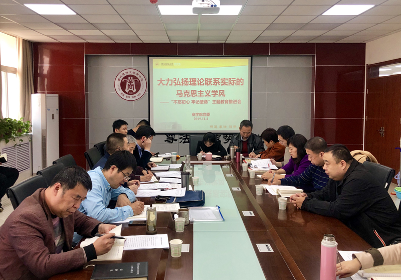 根据主题教育工作安排,11月4日,商学院党委中心组及扩大成员在学院资料室召开“大力弘扬理论联系实际的马克思主义学风——不忘初心,牢记使命”主题教育推进会。校巡回指导组一组组长刘育龙、院领导班子成员、各党支部书记、各系部负责人、全体学工干部、行政人员及学生党员代表参加会议,会议由院党委书记路建潮主持。