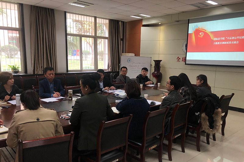 为深入推进“不忘初心、牢记使命”主题教育往深里走、往实里走,10月29日中午,国际法学院在格物楼会议室召开“不忘初心、牢记使命”主题教育调研成果交流会。国际法学院班子成员、党委委员、教研室主任、党支部书记、科级干部、职工代表共计20余人参加会议。校巡回指导二组成员秦立出席,院党委书记李立主持会议。