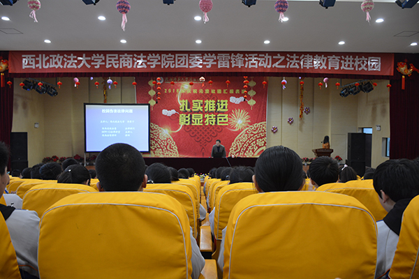 2018年3月9日下午,民商法学院团委组织学生会在陕西师范大学万科中学开展学雷锋活动。此次学雷锋活动以法律教育为主题,万科中学副校长刘波、德育处主任上官林、团委书记陈亚茹、八年级全体班主任及学生,民商法学院副教授李康宁,学院辅导员李伟弟、刘超等四百余人参加了此次活动。