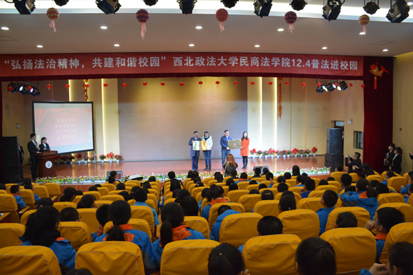 12月4日,西北政法大学民商法学院在陕西师范大学万科中学进行国家宪法日普法宣传活动暨“党团共建基地”与“法律实践基地”挂牌仪式。陕西师范大学万科中学副校长刘波、德育处副主任上官林、团委书记陈亚茹,民商法学院院长张翔、副院长百晓峰及学院辅导员刘妍良、刘文佳、刘超、李伟弟,民商法学院全体学生会干部以及陕西师范大学万科中学七年级全体学生和八年级学生代表共计500余人参加了此次活动。