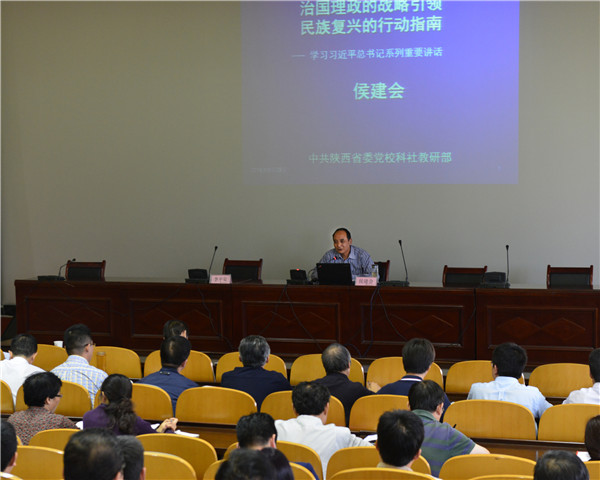 9月28日下午,我校“两学一做”学习教育专题培训班第二场辅导报告会在长安校区举行。中共陕西省委党校科学社会主义教研部副主任侯建会教授应邀作了题为“治国理政的战略引领,民族复兴的行动指南——学习习近平总书记系列重要讲话”的辅导报告。校领导罗新远、宣力、刘鹏伟、李玉朝,全校处科级干部和党支部书记共400余人参加报告会。校党委副书记李平安主持报告会。