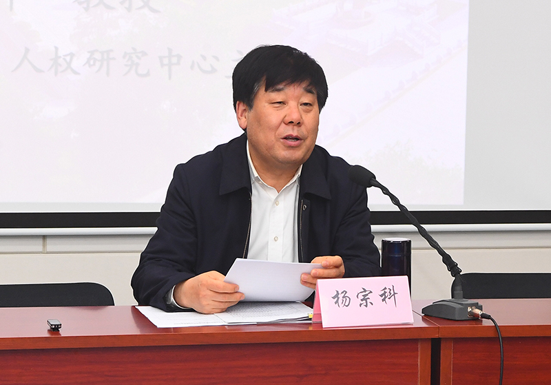 杨宗科发表题为“铸牢中华民族共同体意识,依法促进民族关系团结和谐”的主题演讲,指出学习习近平总书记参加内蒙古代表团审议时重要讲话精神,要从以下五个方面着手:第一,民族关系关乎大局,既是重大政治问题,又是涉及我们国家治国理政的重要议题;第二,准确把握我国统一多民族国家的基本国情,认识到多民族的大一统、各民族多元一体是中国历史发展的基本规律;第三,铸牢中华民族共同体意识是走中国特色解决民族问题正确道路的核心,要牢固树立各族群众正确的国家观、历史观、民族观、文化观、宗教观;第四,健全民族工作的法律法规体系,针对中国特色社会主义进入新时代后出现的一些新情况、新问题,用法律法规进行完善;第五,依法保障各民族合法权益,各民族在法律面前一律平等,要用法治形式与合理规范有效解决少数民族地区经济社会发展中存在的问题。杨宗科强调,这五个方面是引领课题研究及学科建设的正确方向,对人权研究中心的发展建设进一步指明了前进方向、提供了根本遵循。