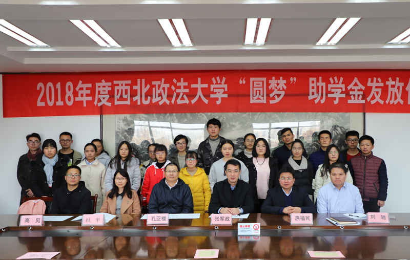 12月11日中午,西北政法大学2018年度圆梦助学金发放仪式在我校长安校区举行。副校长张军政、圆梦助学金创设人孔亚楼,校友工作办公室、学工部负责同志,有关学院党委副书记及所有受助学生参加了本次发放仪式。发放仪式由学工部部长、学生处处长燕福民主持。