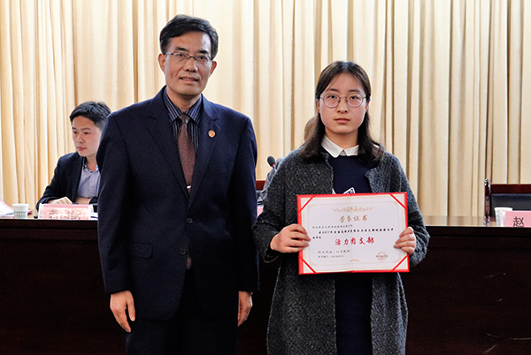 赵健为2017年度“全国活力团支部”获得者西北政法大学书画棋团支部颁发荣誉证书并为第九期骨干培训班学员授旗。学工部副部长、学生处副处长蒋国纲宣读《关于举办西北政法大学青年马克思主义者培养工程第九期大学生骨干培训班的通知》。校团委副书记燕楠宣读《大学生骨干培训班纪律及考评办法》。