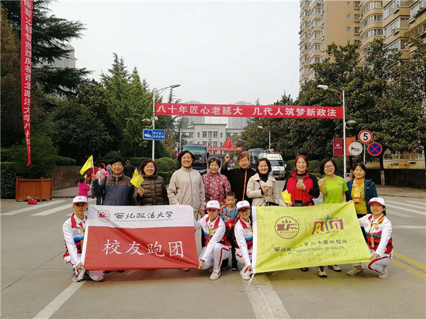 在雁塔校区,给参加马拉松的校友提供赛前服务,在雁塔校区门口合影留念并协助校友在校庆旗帜上签名留念。