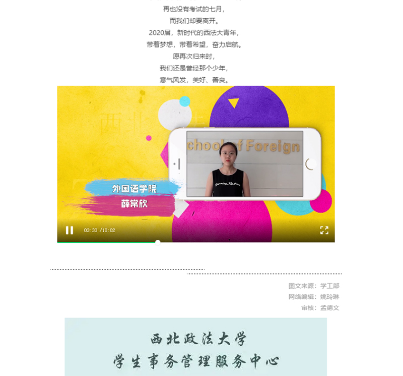学工部积极依托学生事务服务管理中心,收集整理2020届毕业生自入学以来具有纪念意义的众多瞬间照片资料,通过制作视频的形式,梳理全体学生成长、成才的全部过程,学校艺术教育中心的全体教师合唱为视频配音,得到了毕业年级学生的一致好评。视频的发布,充分激发了毕业生感恩母校、感谢师恩的真情实感,同时也表达学校对全体2020届毕业生的良好祝福。