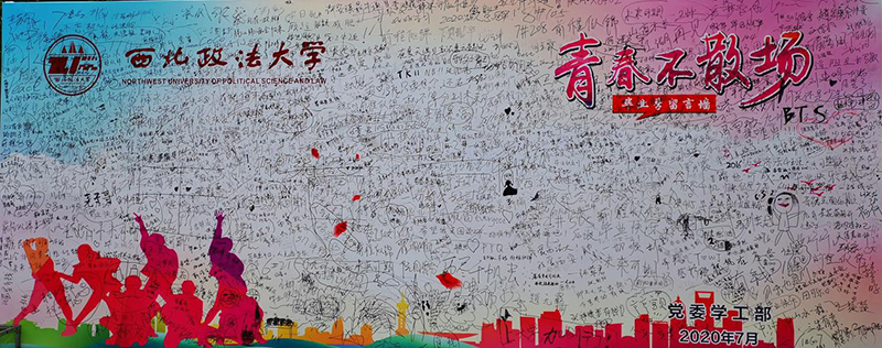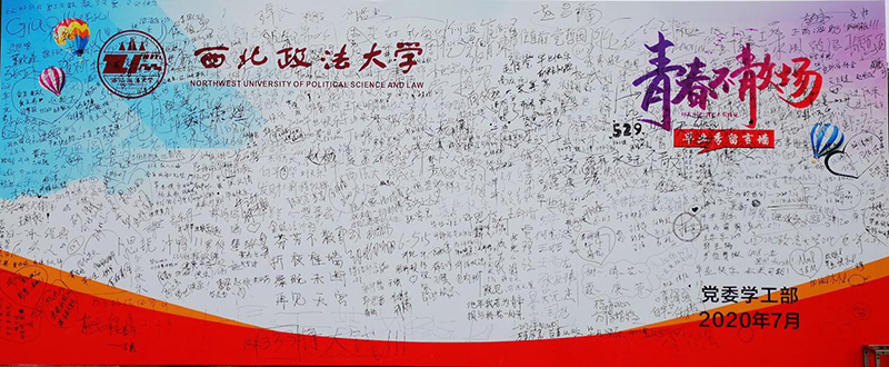 学工部以喷绘桁架的方式制作毕业留言墙,分别摆放在学生食堂门口、长安校区天平楼广场等地点,鼓励广大毕业生在留言墙书写自己对学校的祝福、对未来的期待、对学弟学妹的鼓励,营造浓浓的爱校、荣校之情。