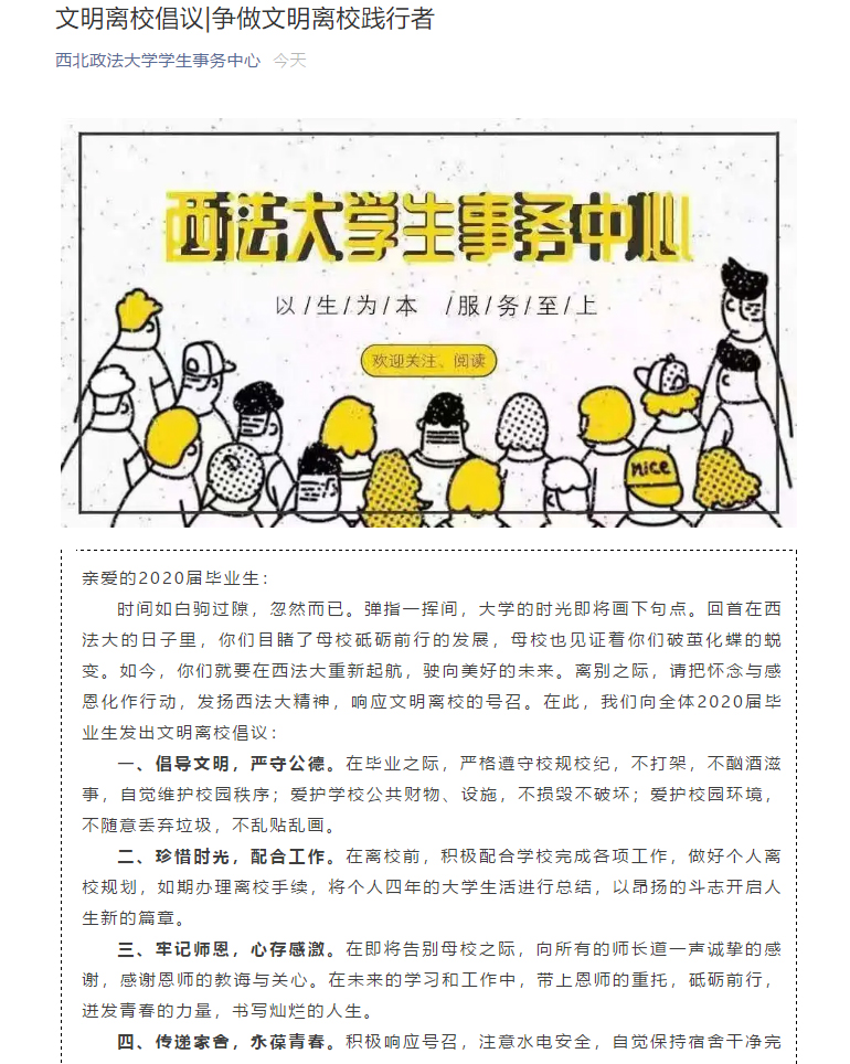 为全力做好2020届毕业生文明离校工作,通过微信公众号发布文明离校倡议书,引导学生珍惜大学时光,遵守校规校纪,不酗酒、不滋事,保持宿舍干净卫生,保护公共财物完好无损,根据学校通知,妥善做好个人离校规划,以实际行动维护和谐、文明、整洁的校园环境。