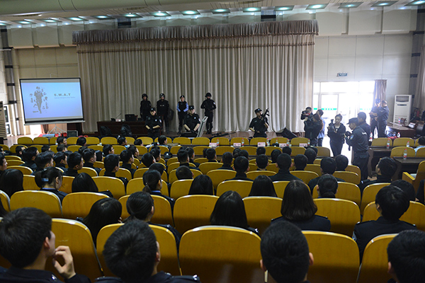 活动的第一阶段首先由公安学院院长程军伟教授致辞,他指出警营开放日作为一项体现一线干警精神、警械使用指导、实用警务技能讲解的活动,可以引领学生将课堂中学到的理论知识与专业领域的实务进行有效的对接,从而使得理论更贴近实践,发挥其应有的作用。紧接着由特警支队政委王炜警监致辞,王警监从西安市特警支队的成立历史、发展概况和重要战绩、参与的大案要案为同学们展示了一个更为全面的支队形象。同时他鼓励在校的有志青年,充分展现自己的朝气与梦想,加入到特警支队这支优秀的队伍中去。活动第二阶段,由我校公安学院2010级校友、西安市公安局特警支队一大队奥晓佳警官主持,几位警官主要围绕支队基本情况介绍、武器、装备展示与讲解、查缉战术警务技能培训、徒手控制与解脱技能培训、女子防身术展示与讲解、西安公安、特警公务员招录情况等几个方面的内容,理论与案例相结合,深入浅出,为同学们进行了生动活波、内容丰富的警务技能讲解。
