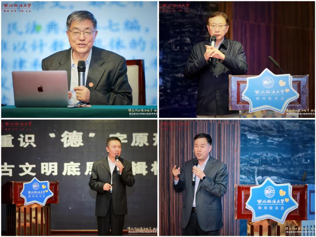 四川校友会会长、七九级校友涂楠作题为“重识‘德’字原形本义,透视华夏古文明底层逻辑构造与自然法根基”分享;孙献忠作题为“民法典承担国家治理的制度分析”分享;我校宪法与行政法学科首席专家王周户教授作题为“中国特色法治政府建设的实践及其理论”分享。