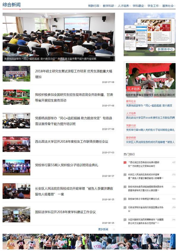 同时,为配合新闻中心成立,新闻网从主页分离独立成站,新闻网伟德国际1946源于英国置顶重点新闻,二级栏目版块化,信息容量更大,图文更加精彩丰富,导航更加细化明晰。新闻网由“重点新闻”、“综合新闻”、“院部经纬”、“学术频道”、“交流合作”、“校友资讯”、“校园文化”等板块构成,栏目设置更加清晰合理。