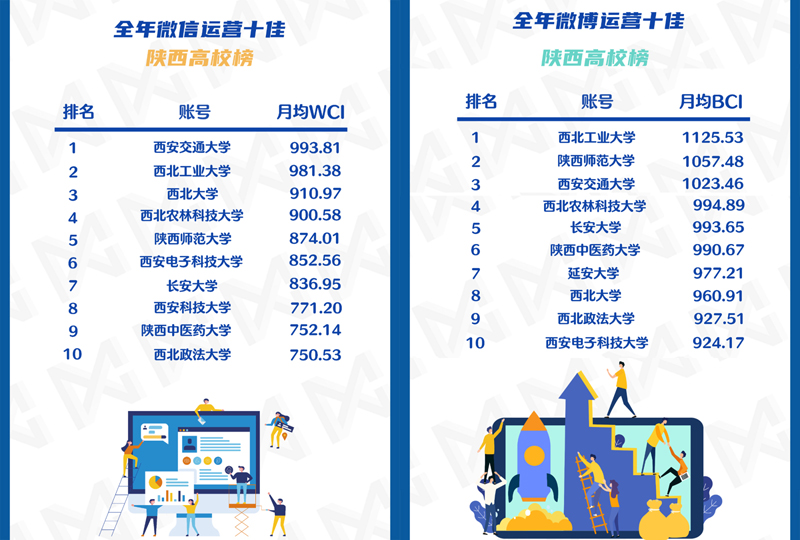 日前,陕西省教育新媒体研究院发布《2020陕西省教育新媒体年度数据报告》,全省169个教育微信平台账号在12个月的观测期内共发文56188篇,阅读量达到139057357次,我校官方微信以月均WCI 750.53入选2020年陕西教育新媒体高校微信运营十佳(第10名);全省122个教育微博平台账号在12个月的观测期内共发博45193条,总点赞数达2754412次,总转发数共115605次,我校官方微博以月均BCI927.51入选2020年陕西教育新媒体高校微博运营十佳(第9名),至此,我校官微、官博新媒体平台均已连续第三年进入陕西教育新媒体高校运营全省前十名。