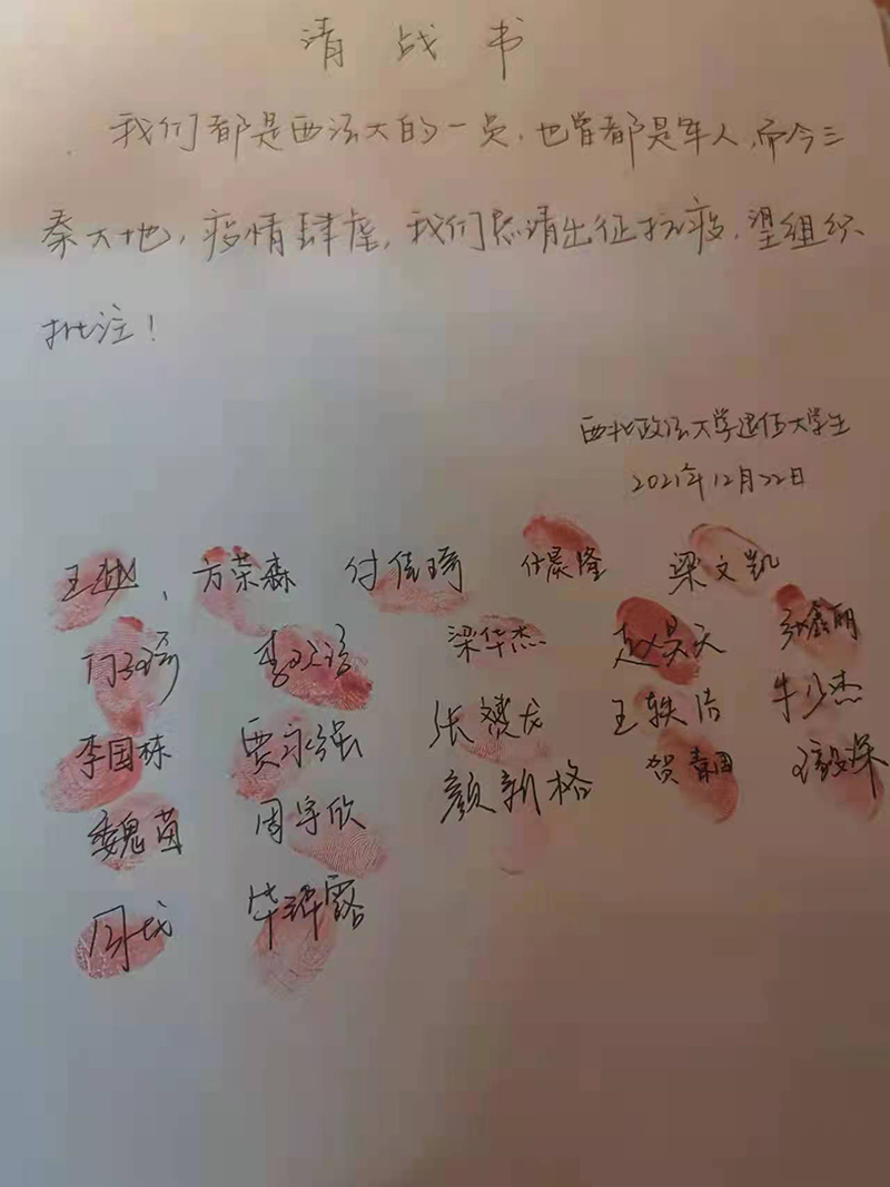 “我们都是西北政法大学的一员,也曾都是军人,而今三秦大地疫情肆虐,我们恳请出征抗疫,望组织批准!”学校20多名名退伍大学生连夜写下“请战书”,要求加入到抗疫一线的队伍中去;公安学院学生第二党支部向全体学生党员发出“共克时艰,党员我先行”的倡议,组建疫情防控党员先锋队;37名退伍军人第一时间向学校提交“请战书”,国旗护卫队全体成员迎难而上,刑事法学院学生组建疫情防控志愿者先锋队,雁塔校区组建9支研究生志愿服务队;校青年志愿者大队第一时间召集抗疫志愿者,232名本科生、研究生服务疫情防控第一线,积极参与门禁管理、核酸检测、扫码测温、物资供应等工作;国际法学院党委向青年志愿者捐赠了1500个口罩;远在深圳的校友为青年志愿者捐赠100套防护服;教职工和家属捐赠400余片暖宝宝;法治学院、法律硕士教育学院2020级法律硕士研究生杨哲向学校捐赠6万只医用外科口罩;刑事法学院张瑞老师给青年志愿者捐赠100余片“暖宝宝”;马克思主义学院硕士研究生张智超同学,向学校教育发展基金会捐赠人民币壹仟元整……