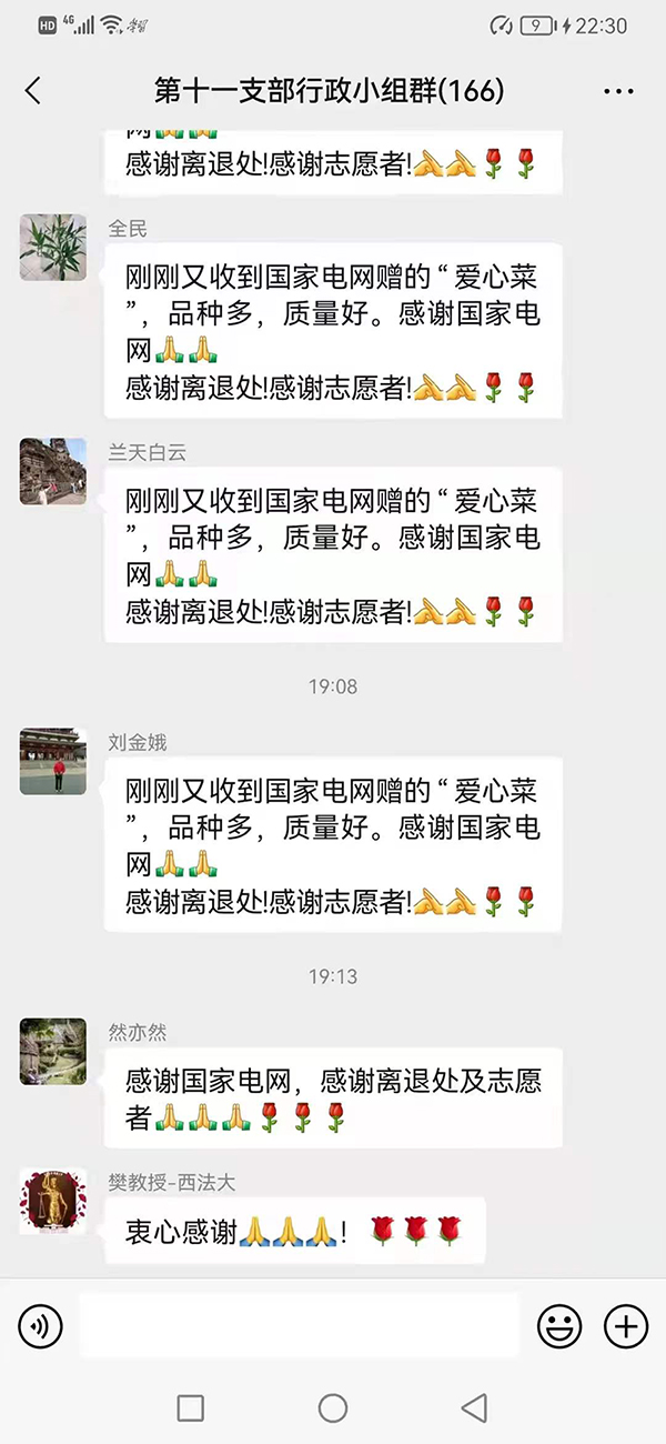 收到物资后,学校已将其分配到学生食堂、离退休职工和教师公寓住户,为广大师生员工和校内住户送去了援助企业的温暖。1月4日我校青年抗疫突击队在发给国网陕西省电力有限公司的感谢信中,满怀深情地写下了这段感人的话语。“风雨来袭携手同心,雪中送炭感恩有你。在这特殊时刻,我校青年志愿者们收到了你们捐赠的抗疫物资,倍感温暖、备受鼓舞、倍增干劲。你们用行动传递温暖、汇聚力量、凝聚信心,彰显着企业的责任与担当。”长安校区离退休老同志微信群里,大家对国网陕西省电力有限公司的爱心捐赠行为纷纷表达感谢。