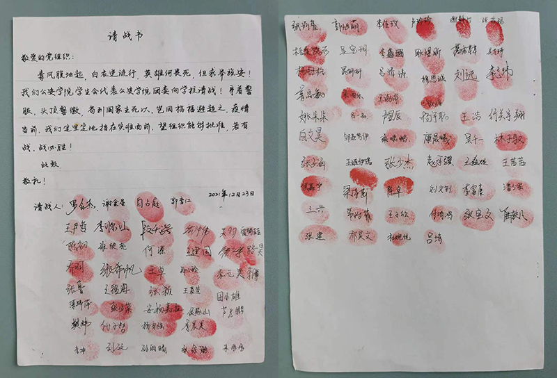 公安学院学生会90余名注册志愿者递交请战书,申请加入学校疫情防控的工作队伍,彰显着西法大青年昂扬向上精神风貌。