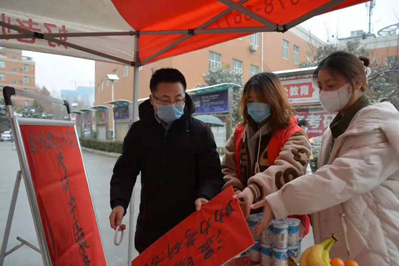 民商法学院团委开展“温暖传递 助力考研”活动,设立“考研学生服务台”,为考试发放预购快餐,提供免费水果、姜汁可乐等,全力以赴守护研考。恰逢元旦,经济学院团委开展了“青春战疫 听见花开”新年线上音乐会,丰富疫情防控下同学们的校园生活,为西安加油!