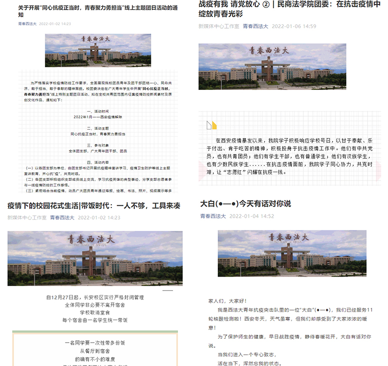 严格落实学校疫情防控工作要求,印发《关于开展“同心抗疫正当时 青春聚力勇担当”线上主题团日活动的通知》,组织全校团支部开展抗疫精神学习、疫情卫生防护、先进事迹分享等线上主题活动,齐心抗“疫”,共克时艰。校团委官方平台“青春西法大”陆续开设了“战疫有我 请党放心”“战疫日记”“宿舍里的花式生活”“大白对你说”等专栏,发布抗疫推文27篇,制作微视频8部,讲好青春抗疫故事,弘扬向上向善正能量。同时,开展校园疫情防控新闻素材及原创文化作品征集活动,引导团员青年充分发挥特长爱好,创作抗疫文化作品,科普抗疫知识,共同筑牢疫情防控的青春“防火墙”。学校共青团组织青年志愿者抗疫的事迹,被中青报、陕西省教育厅、人民号多次报道转发。在抓好疫情防控工作的同时,也必须抓好政治理论学习不放松,学校共青团“青年大学习”比率始终居全省前列。新闻传播学院团委、哲学与社会发展学院团委、刑事法学院团委线上学习伟大抗疫精神,引导大家不信谣、不传谣,进一步坚定了战胜疫情的信心和决心。商学院团委开设“战疫情 亮身份 显担当”专栏,选树疫情防控工作中表现突出的青年典型,汇聚向上向善的青春正能量,弘扬社会主义核心价值观。