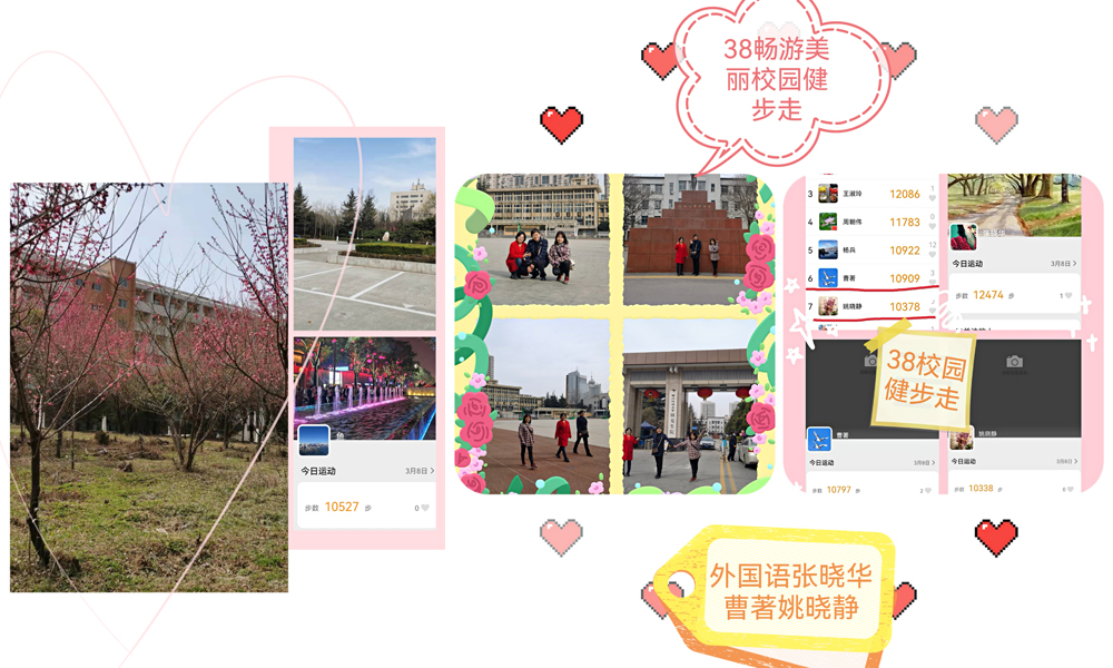 为了深入落实“健康中国”战略要求,充分发挥健身运动在提高女教职工身体素质和健康水平,促进女教职工全面发展,丰富广大女教职工精神文化生活,3月8日当天,我校广大女教职工携三两好友,畅游校园,锻炼身体的同时赏满校春光,并分享了自己在锻炼过程中拍摄的最具春天气息的校园春景或合影,不仅提高了自身的身体素质,还激发了她们对校园的热爱之情。