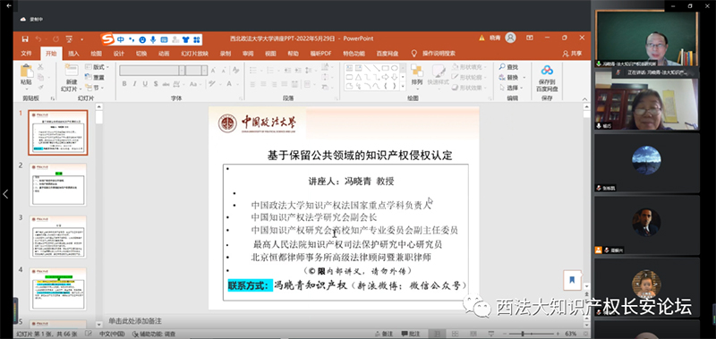 科技活动周宣传期间,我校“陕西省公众科学素质与法治国家建设研究中心”成功举办2022年科技宣传周系列活动之“基于保留公共领域的知识产权侵权认定”主题讲座。本次讲座特邀中国政法大学知识产权法研究所所长、博士生导师冯晓青教授主讲,来自多所高校的80余名师生在线上共同参与。冯晓青教授以公共领域之于知识产权法的重要意义引出了本次讲座的主题,对基于保留公共领域的知识产权侵权认定问题进行了深入的讨论,与谈老师就讲座内容从多个维度提出了自己的见解。