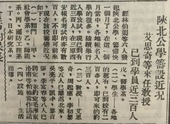 资料记载,陕北公学自1937年8月开始接收学生,到11月1日正式开学。不到两个多月,加上抗大划拨过来二百多人,就有新学员六百余人。