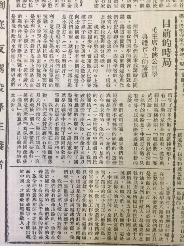 ▲1937年11月4日《新中华报》刊登毛泽东在陕公开学典礼上的讲话