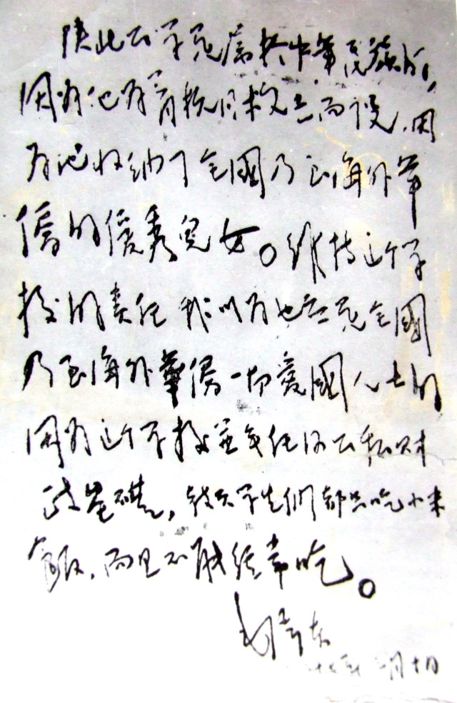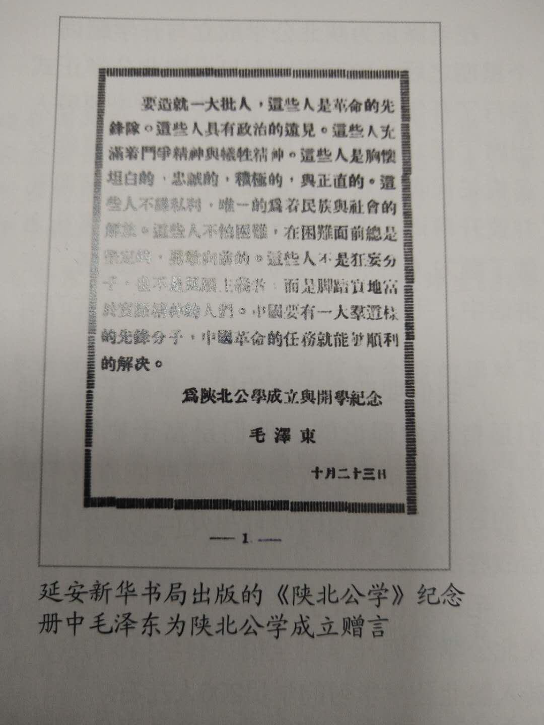 1937年10月23日,陕北公学正式开学前,毛泽东为陕北公学成立题词,这是他给陕北公学的第一次题词,也是最重要、最长的题词。