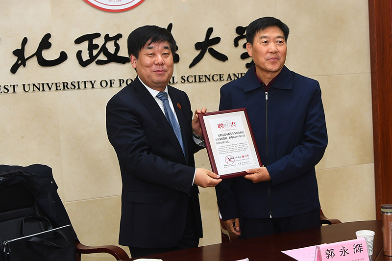 杨宗科代表学校对郭永辉校友回到母校担任兼职教授、参与博士人才培养表示热烈欢迎和衷心感谢。他指出,作为在边疆工作的西北政法大学校友中的杰出代表,郭永辉为国家边疆的安全稳定贡献了自己的力量,积累了丰富的实践经验,为我校西北地区国家安全法治研究工作做出了突出贡献。他相信,有了郭永辉的加盟,学校将在中国特色、西北特征、新疆特点的国家安全法治治理体系中做出更大的贡献。