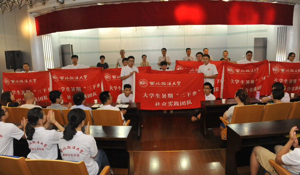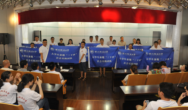 旗帜飞扬,掌声响亮。为深入学习贯彻习近平总书记关于青年成长成才的一系列重要讲话精神,培育和践行社会主义核心价值观,引导和帮助广大青年学生在实践中认识国情、了解社会、增长才干,7月8日下午在行政楼二楼报告厅,我校隆重举行了2016年暑期“三下乡”社会实践活动出征仪式。校党委副书记赵健,学工部部长、学生处处长张军政,反恐怖主义法学院副教授古丽那尔,马克思主义教育研究院副教授刘建国,保卫部副部长、保卫处副处长陈建宁,校团委副书记燕楠等同志及各院系团委书记、实践项目负责老师、各分队学生共200余人参加了活动。仪式由校团委书记宋白主持。