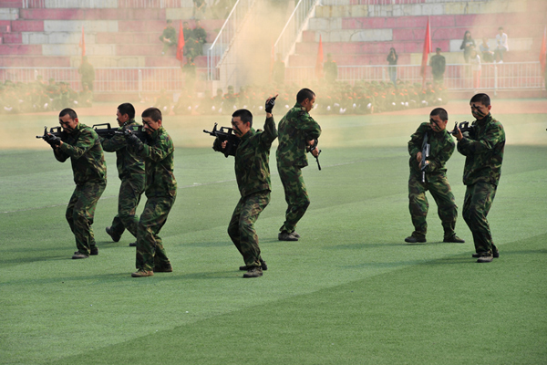 伴随着雄壮的《中国人民解放军军歌》,军训总结大会开始。军训汇报表演中。首先进行了军训旅分列式,随后六团新生带来了军体拳表演,一招一式中都蕴藏着无限的力量。七团女生进行了军训基本动作演示,展现出巾帼不让须眉的风采,二团表演了匍匐前进等动作,五团的战术表演方阵将全场气氛推向高潮,格斗、擒拿、背部碎棍等战术表演让全场欢呼不断,掌声如潮。