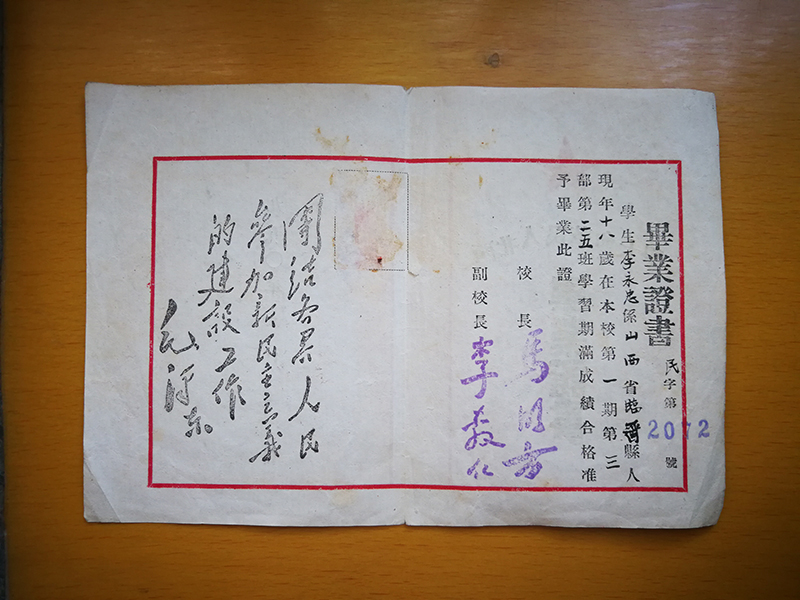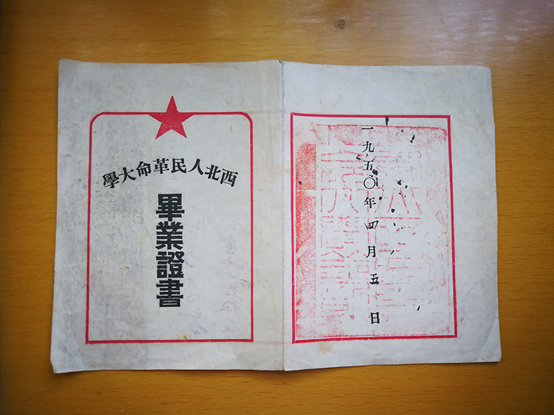我们是19498月底入学,次年4月初毕业。学校号召我们到最艰苦的地方去,大家认为谁要想留在西安,就是思想不积极。毕业时发展党员,我们班120多人,40多人申请,支部选出十几个人讨论评议,最后只批准了2个人入党,我就是其中之一,所以我的党龄有70年。当时,我非常激动。