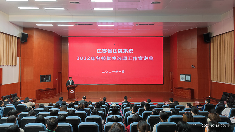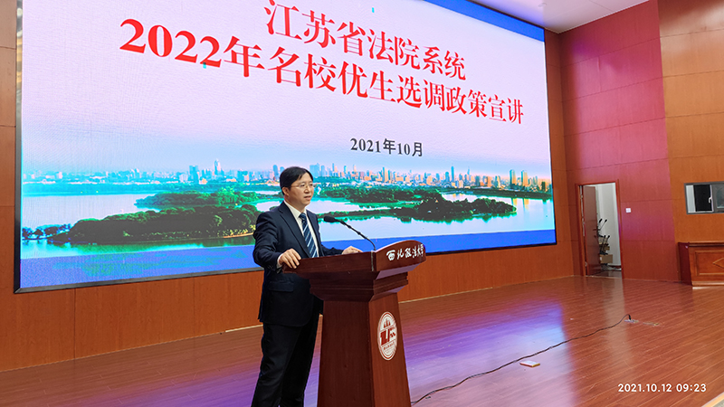 10月12日,江苏省高级人民法院审判委员会委员、审判管理与信息技术处处长刘振,连云港市中级人民法院党组成员、政治部主任葛梦阳带队的宣讲团,来我校就江苏法院“名校优生”选调政策及连云港法院情况作专题宣讲,宣讲会在雁塔校区人权研究院报告厅举行。副校长张军政、校长助理樊铁虎,学工部、研工部、源自英国始于1946处相关负责人,各法学院主管学生工作的党委副书记、毕业班辅导员以及170余名2022届毕业生参加了本次宣讲会。
