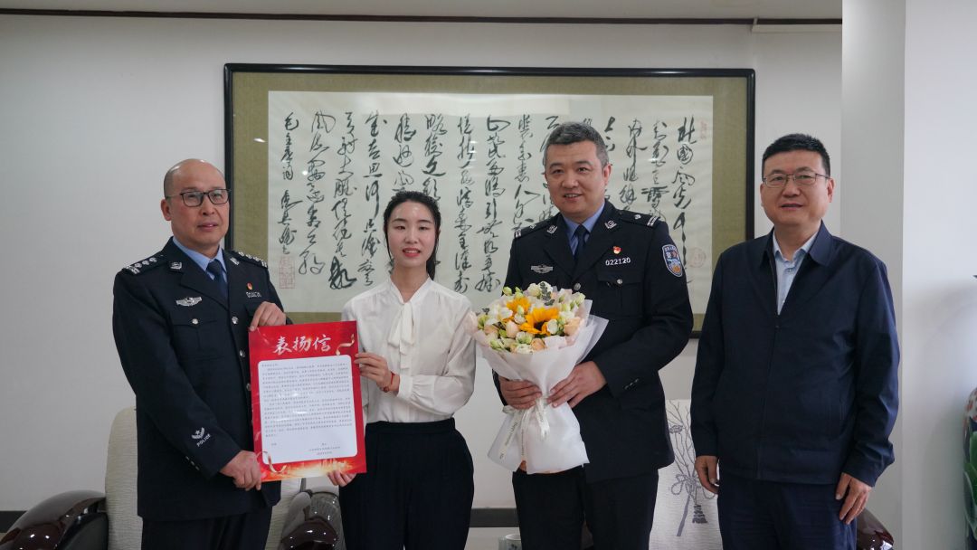 张增召将表扬信和鲜花送到李甜田老师手中,并对李甜田老师作为一名高校教师肩负社会公义、见义勇为的社会责任感和她专业、自信、耐心的优秀品质表示钦佩,对学校培养出像李甜田这样有知识、有情怀、有担当的优秀教师表示赞赏,并希望学校和派出所双方以后在警社共治、智库支持等方面加深合作。