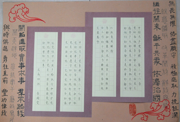 2016年5月,民商法学院“爱党、爱国、爱校”系列活动之二——“手抄党章”活动顺利举行。该活动是对学校“两学一做”学习教育的积极响应,目的在于培养学生的政治意识、大局意识、核心意识和看齐意识。在活动中,同学们充分发挥创新意识,精心挑选书写用纸,字迹俊美飘逸,绘图用心精巧,一笔一划都体现出对党的崇敬之情。